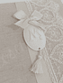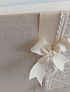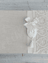Livro de Honra tamanho A4 forrado com tecido de meio linho (50%linho 50%algodão), decorado com fita, renda e peça em gesso. O interior é constituído por 50 folhas A4 de 160gr agrupadas com espiral metálica.
